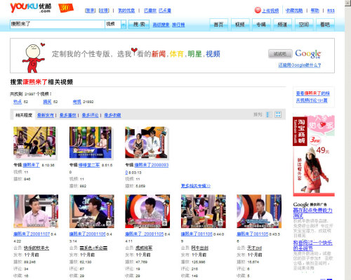 这页搜索框又回到右侧了,优酷的播放区域是靠左侧,宽度大概占了半个屏幕,播放区域下侧是一些常用的用户行为按钮,比如收藏、引用等;右侧是视频信息及相关视频,整个第一屏涵盖了主要的信息,用户可以一目了然无需拖动滚动框。但整个页面的广告部分有点乱,虽然设计师把广告放在右侧尽量不影响用户的浏览,但由于google AD这种是随机产生内容,有时会出现八杆子打不到一起的广告内容,因此页面会显得比较凌乱,我个人并不太赞成放google ad这样的广告,或者是一个页面不要放太多不同类型的广告。