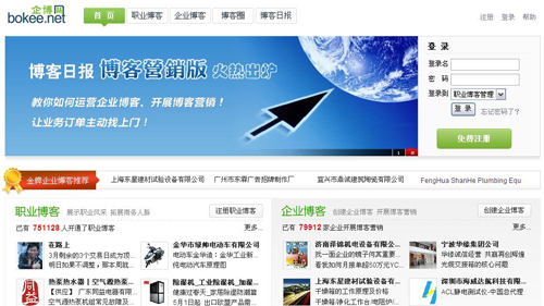 “企博网”(Bokee.net)率先将最新的博客技术和企业及职业人的实际需求相结合,立足各职业人士和各种企业的实际应用,推出了“职业博客”和“企 业博客”的个性化服务。