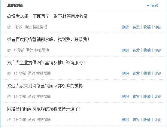 搜狐微博这种快速的方式并不稳定,这种方式毕竟不是长久之计。郭永峰推测当百度再次大更新的时候,会发生大的变化,所以这种方式是适合企业快速营销,快速盈利的技巧。虽然群微博模式会给企业带来不错的营销影响,但站在长远的角度来看,还是要拥有一套微博营销策略。如果企业想了解更多微博营销方法,可以百度网络营销郭永峰找到我,郭永峰愿意分享知识和技巧给大家。